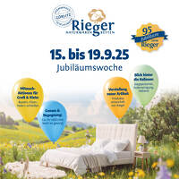 Rieger Betten & Naturwaren feiert 95-jähriges Bestehen – und Sie profitieren das ganze Jahr! Jeden Monat erwartet Sie ein exklusives Jubiläumsangebot. Im Mai und Juni können Sie sich bereits auf diese besonderen Aktionen freuen.